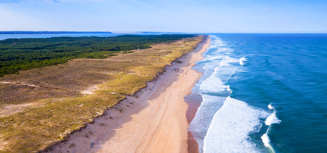 Near Piraillan and a ten-minute drive from Cap Ferret, the beach is accessible via the Avenue du Truc Vert, along a lovely forest walk up and over the dune.