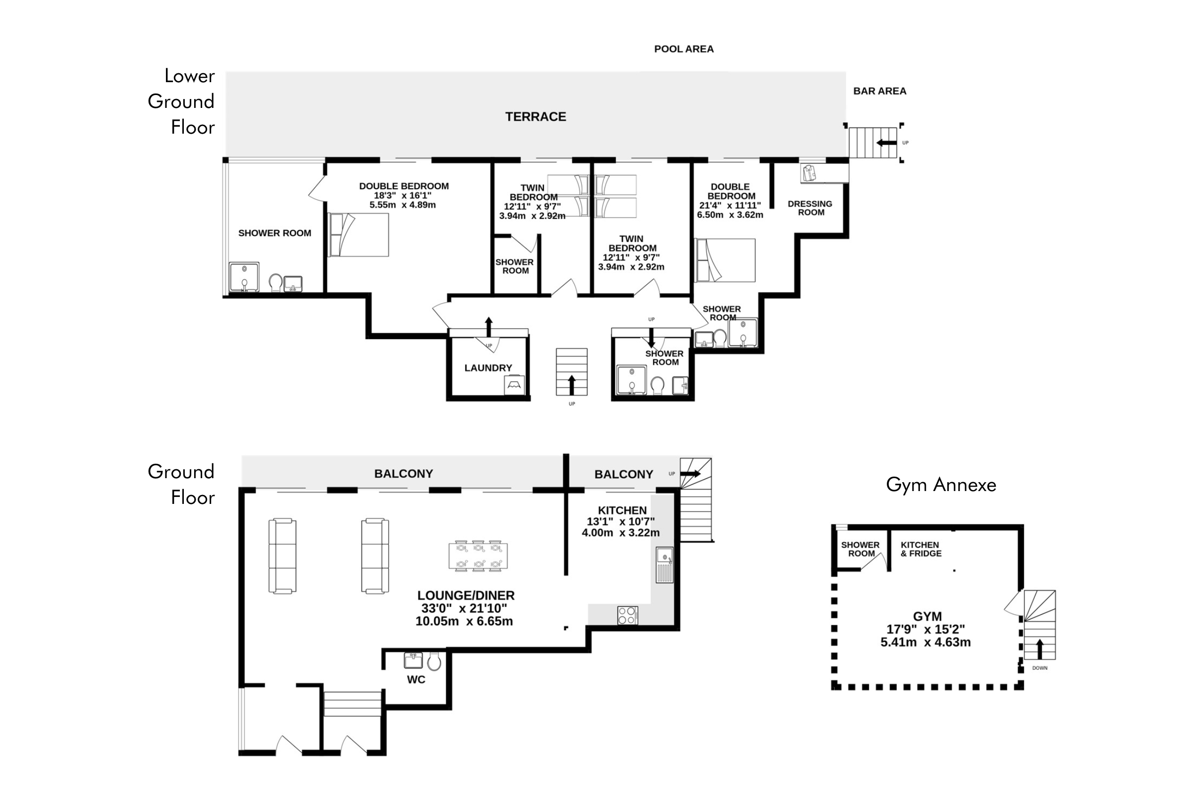 - Master bedroom (160cm bed) with dressing area and desk and en-suite shower room with WC; leads out to terrace