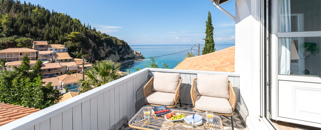 The Loft sits on the top floor of a restored village house in a narrow side street, in a slightly elevated position above the town. A steep staircase leads you to the apartment, which is laid out studio-style and entirely open-plan to create a spacious yet cosy-feeling nest for two. You can choose your sitting-out spot depending on the time of day, with a shaded balcony to the front and a larger, open one to the rear, with lovely views out over the roof-tops of Agios Nikitas and down to the beach lapped by turquoise sea.
