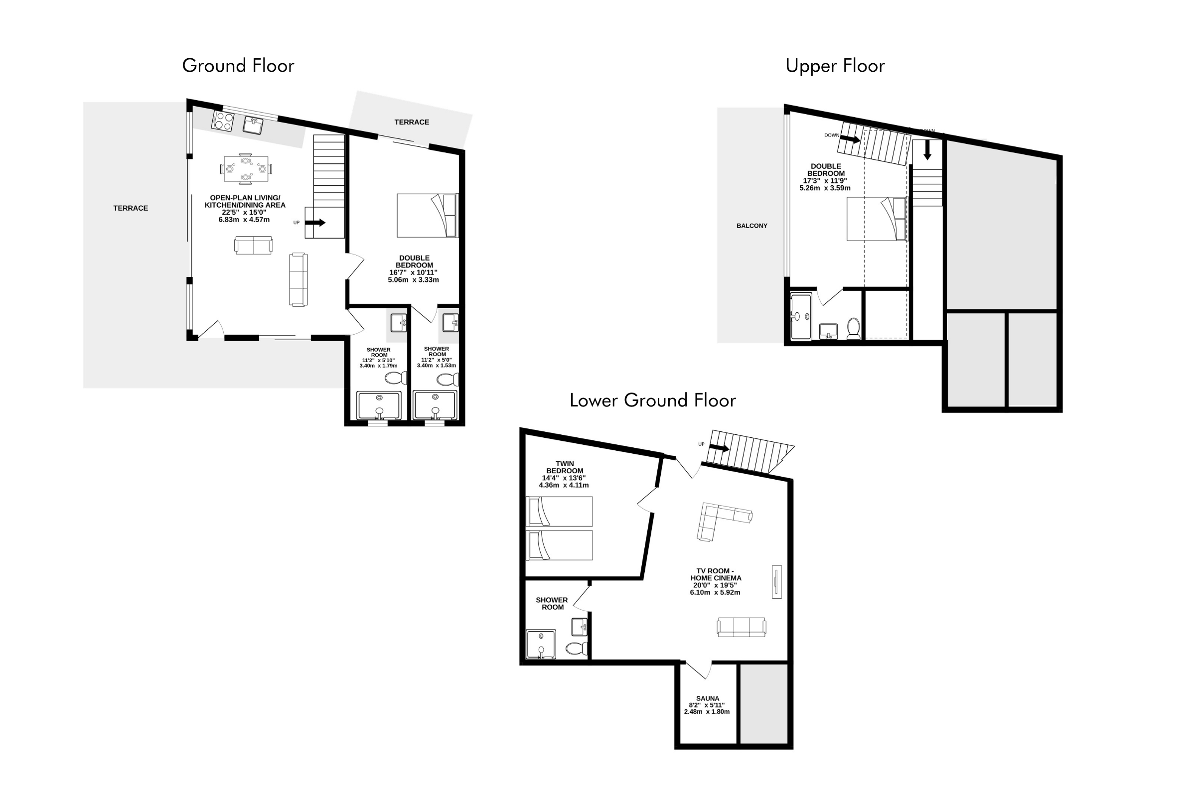 The bedrooms are beautifully decorated and furnished to offer every modern comfort and convenience. The lower ground floor is accessed via a separate entrance and is home to a TV room complete with home cinema system, and there’s also a sauna, shower-room and twin bedroom (which can be made up as a double if preferred). There is a luxurious en-suite double on the ground floor and another double in the eaves on the top floor with an en-suite shower room and balcony.