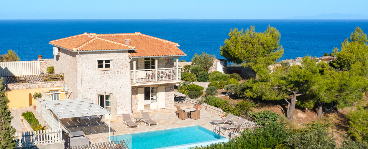 Dressed in beautiful pale golden stone, Villa Athina claims a lofty but unobtrusive position high on the hillside above Agios Nikitas on the west coast of Lefkada. Agios Nikitas is one of the island’s most sought-after villages, with its own pretty beach and enough tavernas to ring the changes for at least a week. It’s a popular spot in the height of summer, but those lucky enough to be staying nearby will find the village quietens considerably as evening falls, so you can enjoy a relaxed stroll around its cobbled streets and traditional buildings as you choose your dinner spot.