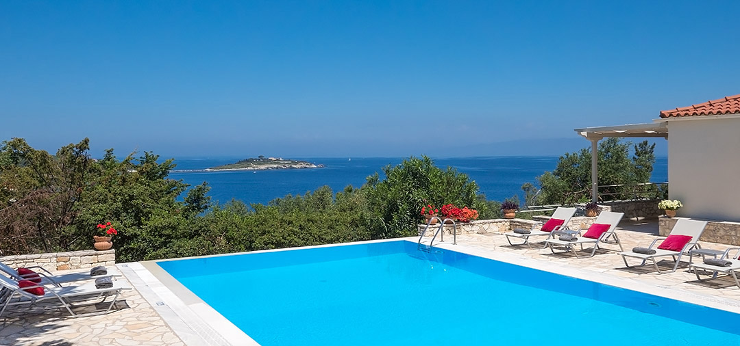 This charming villa, with its numerous shaded terraces and large infinity pool, has a wonderful view of the sea, the island of Panagia, distant Corfu and the mountains of mainland Greece. Flora is an ideal venue for a group of friends or multi-generation party, with a cosy studio guest cottage in the grounds, and an additional small apartment below the main villa available from mid-June to early September.