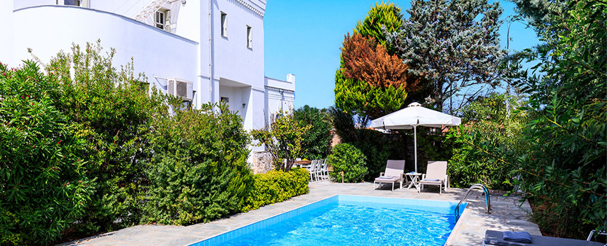 Tucked away in a peaceful residential area, this charming villa was once a rather grand private residence, giving it a touch more character than most purpose-built properties, plus a very privileged position close to Skopelos Town. The villa has been fully modernised with air-con and contemporary bathrooms, whilst retaining some of the original beamed ceilings, fireplaces and a scattering of local antiques for a classic, timeless feel.