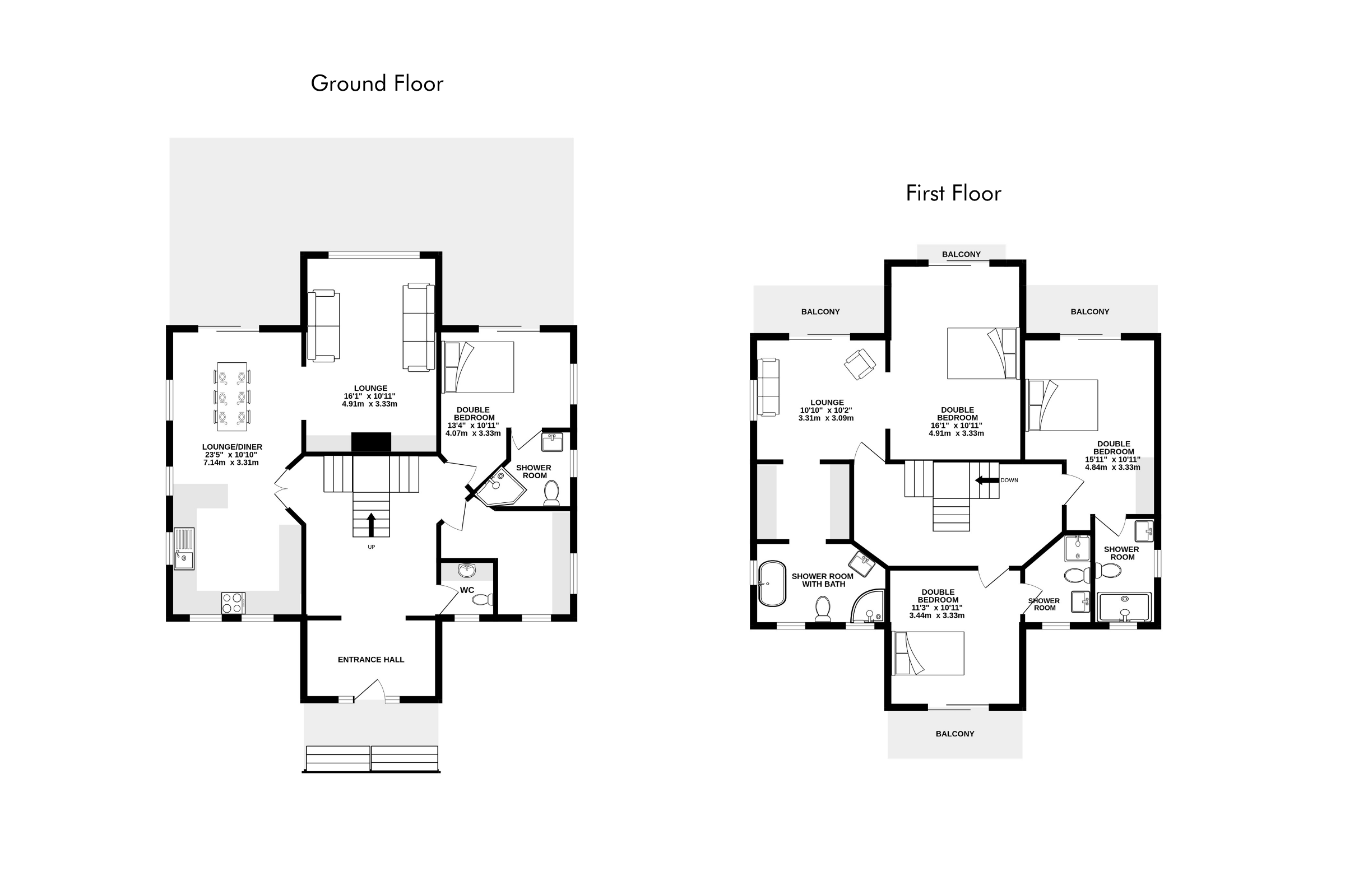 - Bedroom 3: Double bedroom (180cm bed) with en-suite shower room and WC, leads out to balcony